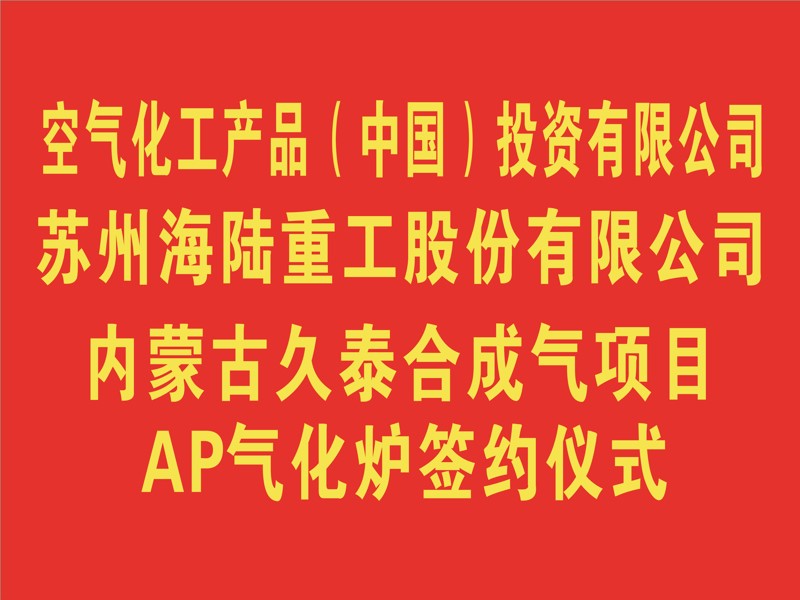 2018年12月6日下午,在海陸重工會議室,空氣化工產品(中國)投資有限公司與蘇州海陸重工股份有限公司,舉行久泰合成氣項目AP氣化爐簽約儀式,AP公司采購總監戴曉輝與海陸重工鍋爐事業部總經理陳吉強分別在簽約書上簽字