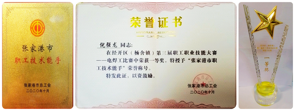 祝賀我公司倪強龍在經開區(楊舍鎮)第三屆職工技能大賽 電焊工比賽中榮獲一等獎,并被 授予“經開區(楊舍鎮)技能 明星”榮譽稱號!